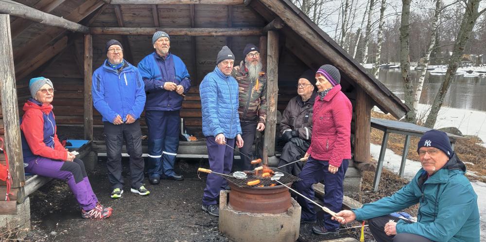 15. maaliskuuta sovittu ”yhteislähtö kävelemään” oli Kuokkalan Nesteen (nykyisin Teboil) huoltoasemalta Koivunokan laavulle. Sieltä meitä lähti tallustelemaan viiden hengen porukka. Onneksi laavulla olikin jo odottelemassa neljä jo aiemmin paikalle tullutta ja jälleen tulet valmiiksi tehnyttä henkilöä. Sitten vielä tuli kaksi reippailijaa paikalle joten lopulta lämpöisien leipien lämmittäjiä ja makkaranpaistajia oli koossa 11 kpl.